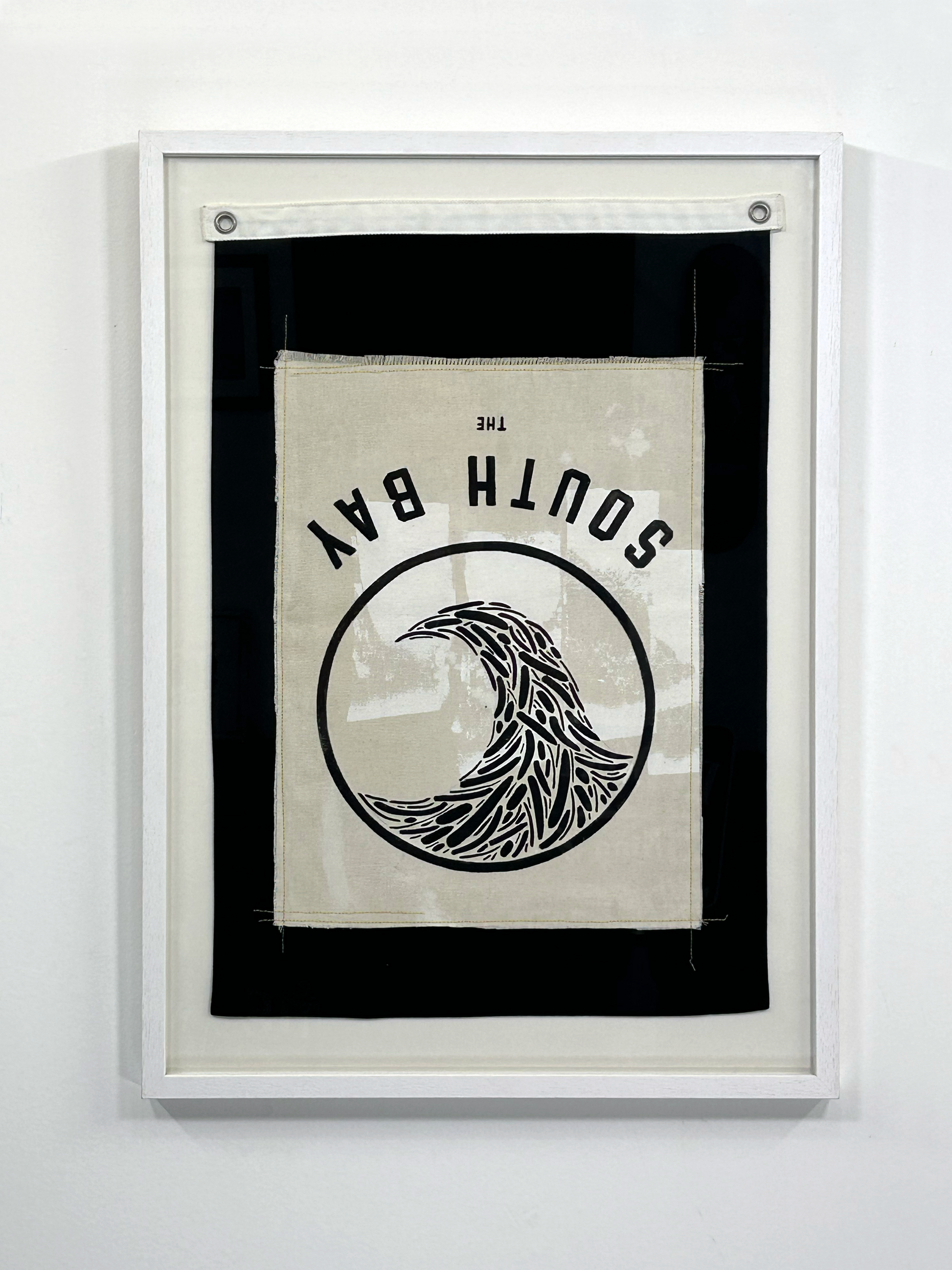 South Bay Capsize Flag painted by John Hudson framed in a white wood grain frame.